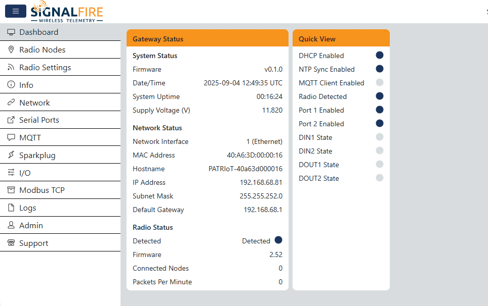 A key advantage of the PATRIoT is its ability to serve as a remote hub for wired signals in addition to wireless nodes. By pairing with SignalFire’s Multi I/O Module (MIOM), users can collect analog and discrete inputs and outputs in the field and connect them to SCADA via the gateway—reducing cable runs and lowering installation costs. With the ability to map up to 30,000 Modbus tags, publish MQTT/SparkPlug data without licenses, and support SignalFire Cloud’s monitoring and control features, the PATRIoT is built for both efficiency and flexibility.