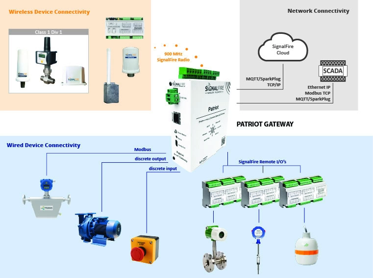 Supporting SignalFire’s 900 MHz wireless network, Modbus devices, and wired inputs, the PATRIoT delivers data through a wide range of communication standards including Modbus TCP, EtherNet/IP, and MQTT/SparkPlug. This versatility allows operators to unify diverse signals into one scalable, secure, and cloud-ready platform.