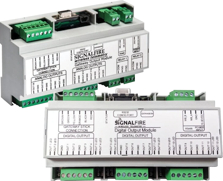 The SignalFire Gateway Output Modules as designed to be used to create analog/digital outputs from any cached register data in the Gateway. This is useful in cases where the host system does not have a Modbus interface. There are two versions of the Gateway Output Module, the first has 8 Analog output and 2 relay outputs, while the second has 12 Digital Outputs. It is possible to connect any combination of two modules per gateway.