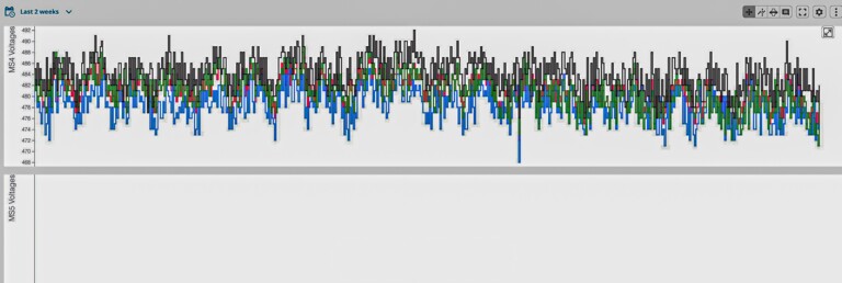 CHARTS: Allows users to trend any tag in the system. The above is a trend of the 3 phase voltages from a single motor.